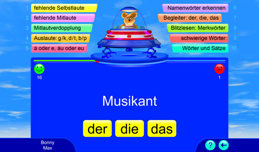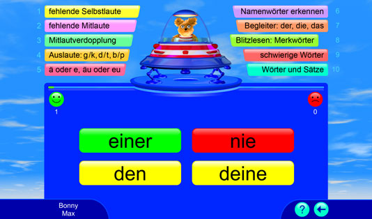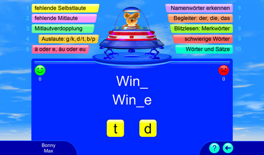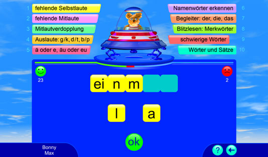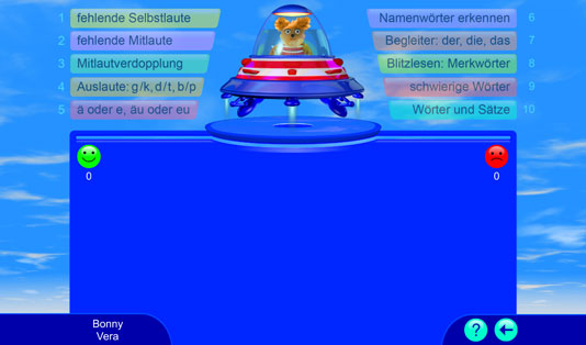 Dieses Lernspiel bietet über 2.000 deutsche Übungswörter für ein systematisches Rechtschreib- und Wortschatztraining. Alle Wörter werden vorgelesen. Die Spieler bekommen eine sofortige Rückmeldung, ob die Aufgabe richtig oder falsch gelöst wurde. Bei einem Fehler wird die richtige Lösung automatisch gezeigt; so können wiederkehrende Muster und Regelungen entdeckt und angewendet werden. Falsch gelöste Aufgaben werden nach dem „Karteikartenprinzip“ wiederholt. Hier wird spielend die deutsche Rechtschreibung gelernt.