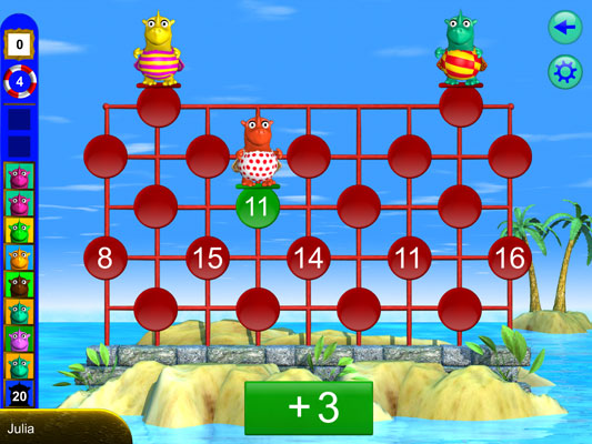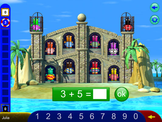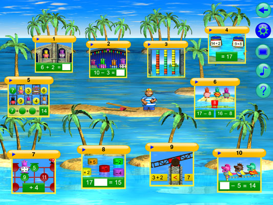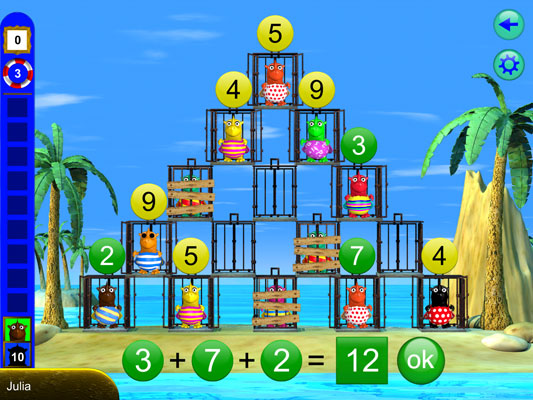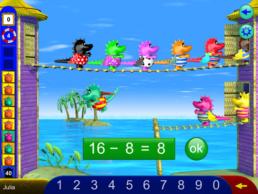 Additions- und Subtraktionsaufgaben bis 20 mit und ohne Zehnerübergang • Summen und Differenzen ausrechnen • Gleichungen richtig ergänzen • passende Rechenzeichen in eine Gleichung einsetzen • Gleichungen mit wechselnden Platzhaltern lösen • zu Ergebnissen die passenden Aufgaben finden • Addieren von 3 Zahlen • Zahlzerlegungen von 10 • größer, kleiner, gleich unterscheiden und die entsprechenden Rechenzeichen > = < erkennen • 2. Chance mit Lösungsweg durch Rettungsring-Hilfe • mit ausführlicher Fehlerstatistik für alle Spieler • Motivierender Highscore und Urkunden-Sammelalbu